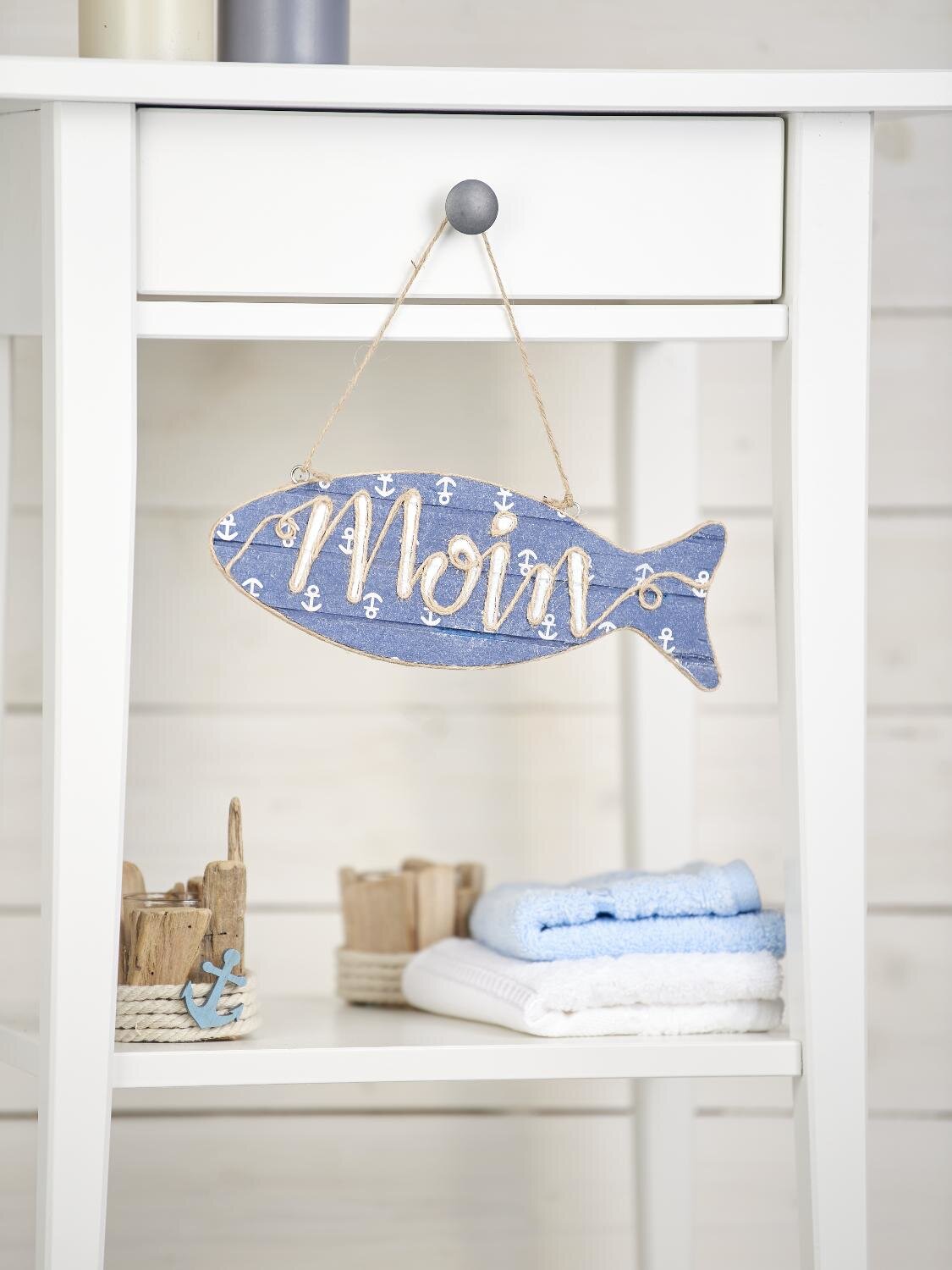 The fish-sign is complete with Napkin overdrawn. For this purpose, the white paper layers are removed so that only still has the printed paper layer. The wooden sign is coated with Napkin varnish , the napkin layer is carefully applied. With the Strich-Ex-pen now the word "Moin" or an alternative message is written on the fish. This is done with the Posca Marker traced and then painted