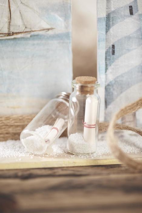 While all parts are drying, two glass tubes can be filled with Decorative sand and one rolled up with a paper roll bound together with Ribbon - the small tubes are simply closed with a cork. They have become a cute and very decorative message in a bottle .