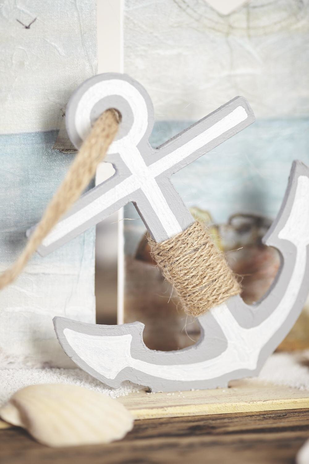 The MDF anchor is painted with white and grey Handicraft paint It is then wrapped with Jute ribbon . A piece of Jute ribbon is also pulled through the anchor - it looks like a sail rope.