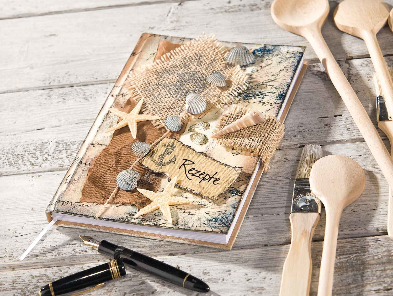 As a special eye-catcher you now dye a few small shells with stamping ink, drill small holes into them and thread them on a thread from the plucking. Fasten the ends in the book with a strip of adhesive tape, the shells with some hot glue. Now decorate with single mussels and starfish and your beautiful maritime cookbook is ready.
