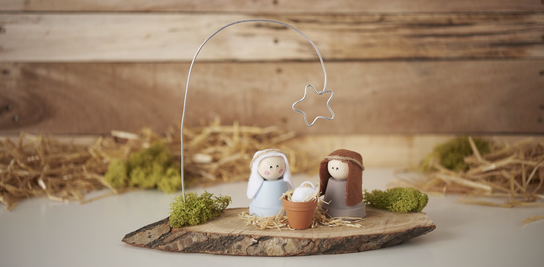 To make the baby Jesus, cut a small felt circle (approx. Ø 5 cm) and wrap it around a small wooden ball Ø12 mm so that it looks like a head sticking out of a bundle. Fix everything with glue and then stick it into a small pot (approx. Ø 3 cm) lined with a little straw .