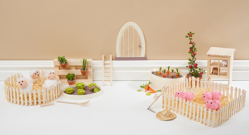 Now make a rabbit hutch from the wooden sticks and the window. This you can fill with two pompom rabbits, cabbage leaves, carrots and excelsior.