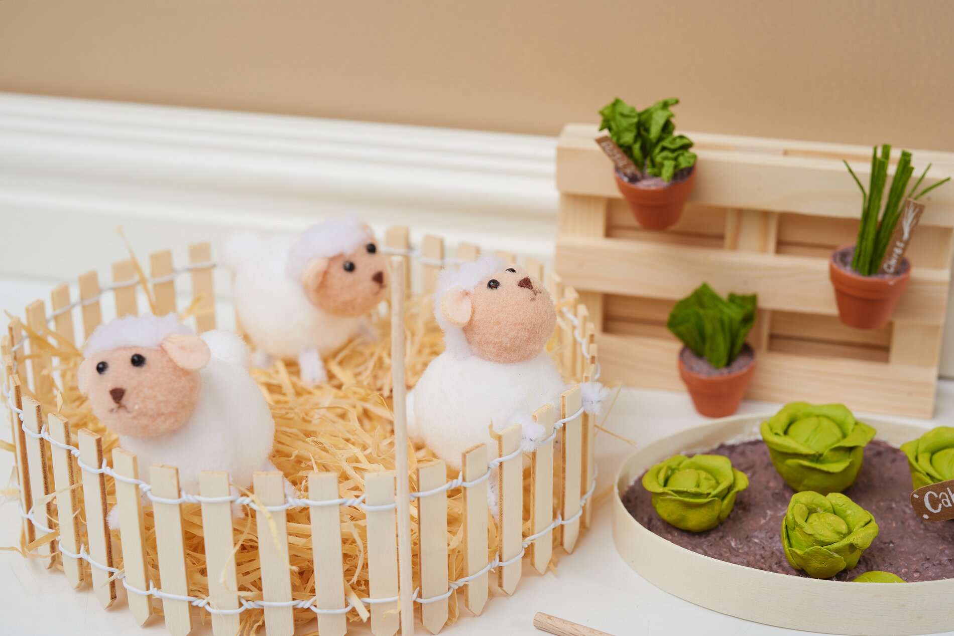 After that, bend small enclosures from the fence, decorate them with excelsior and decorate them. Then put the sheep and pigs inside.