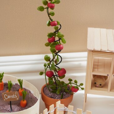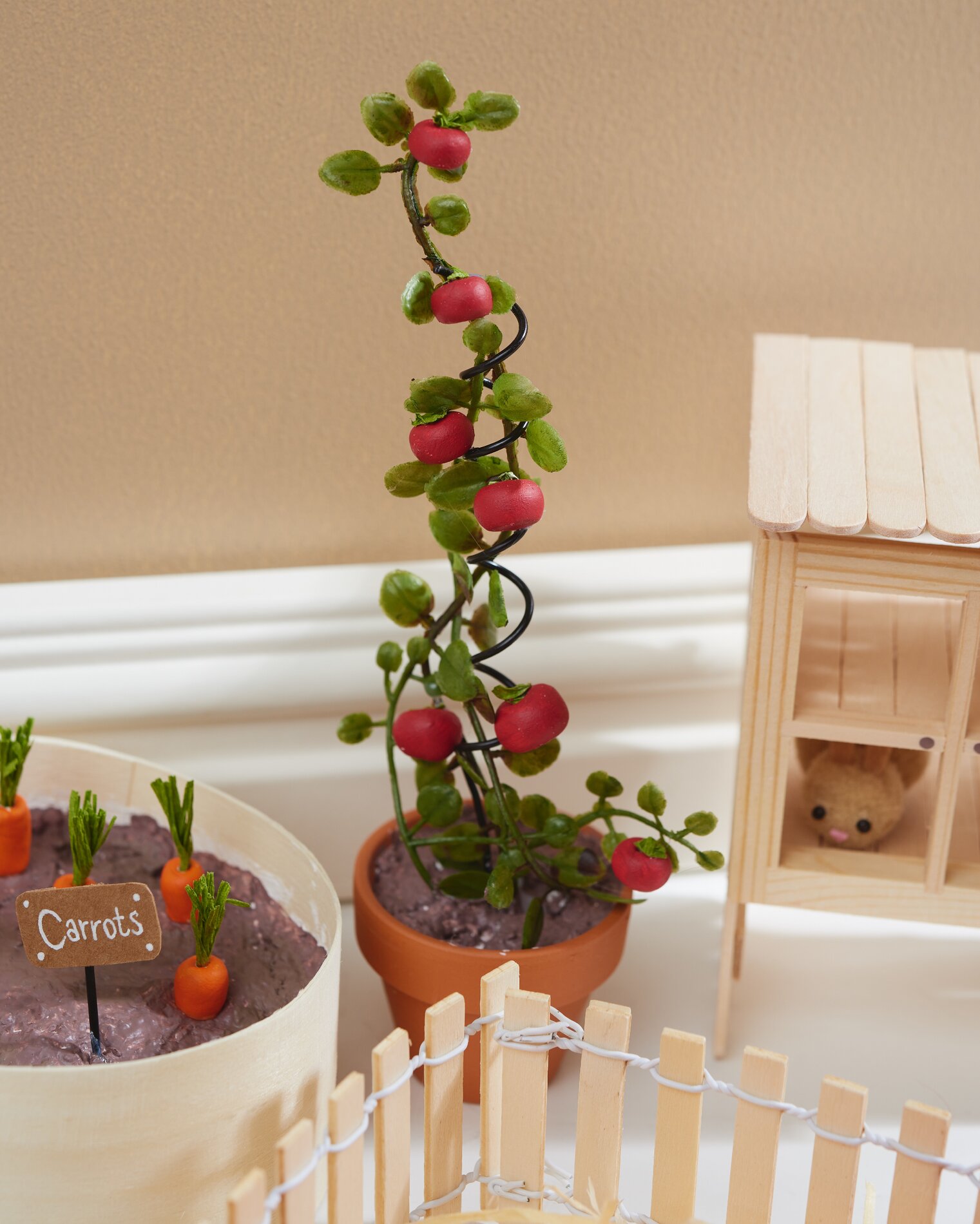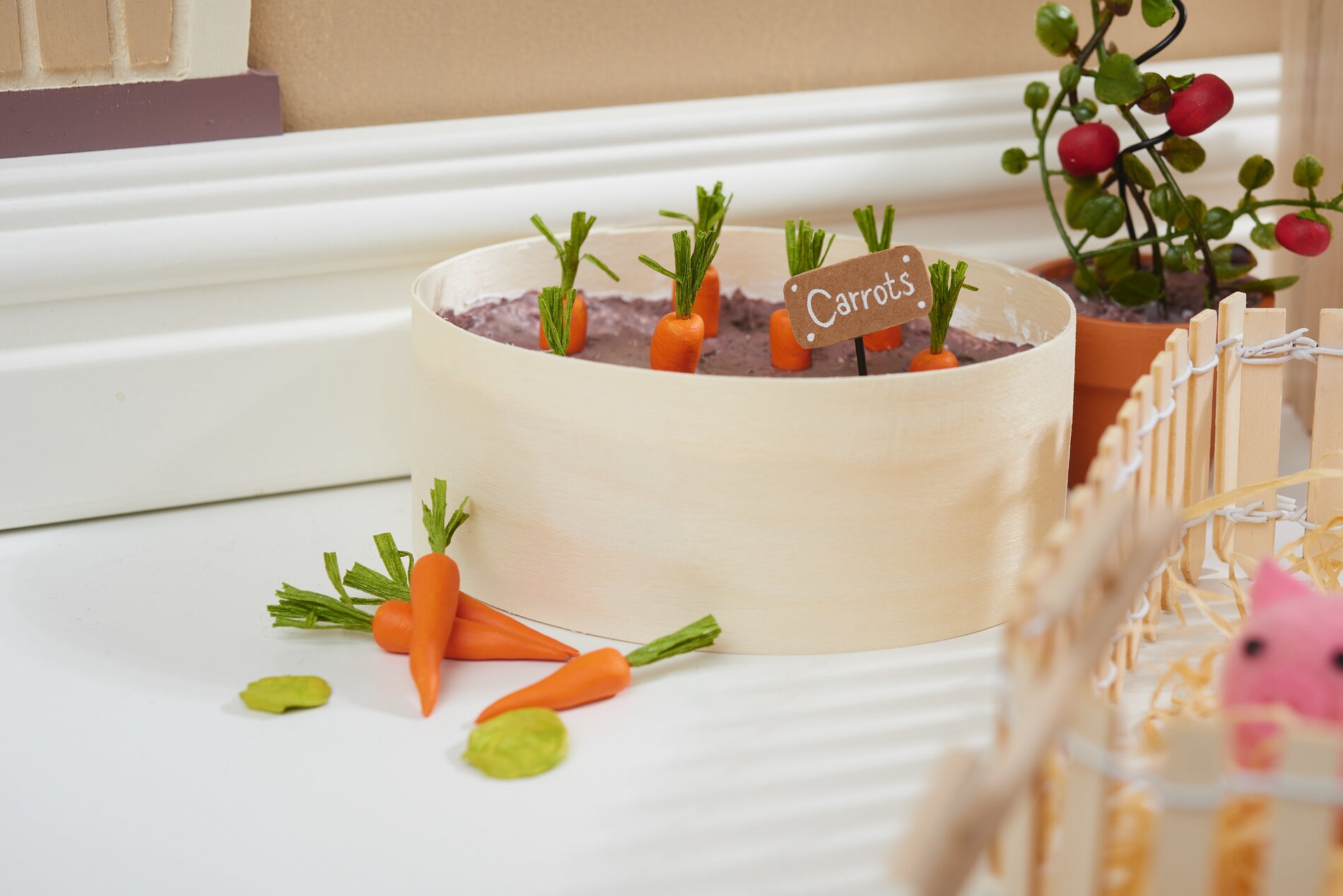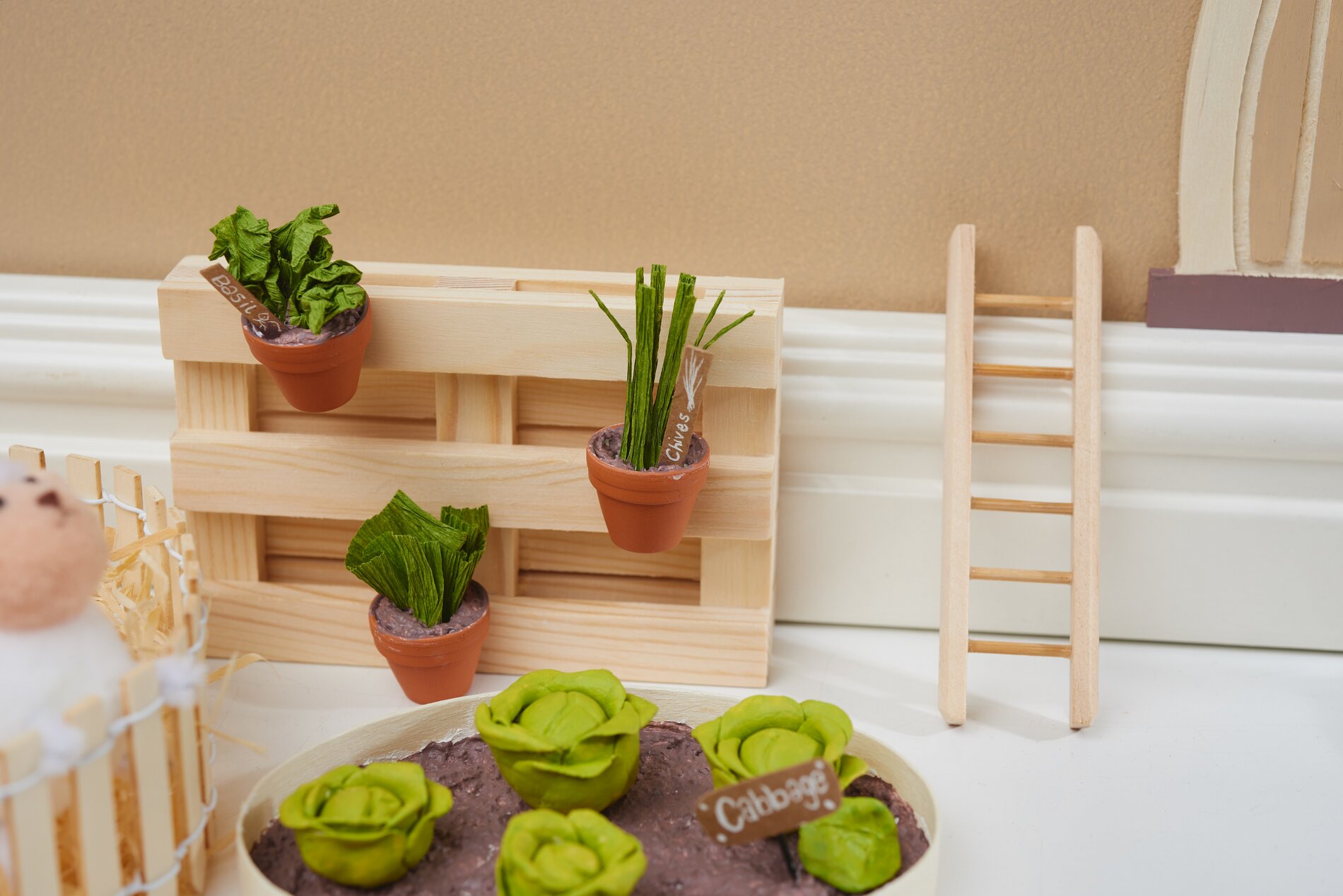 Arrange and glue the half carrots in one bed so that it looks like they are just peeking out of the ground. In the second bed, glue the cabbages. Now glue the tomatoes to the corresponding plant with some hot glue.