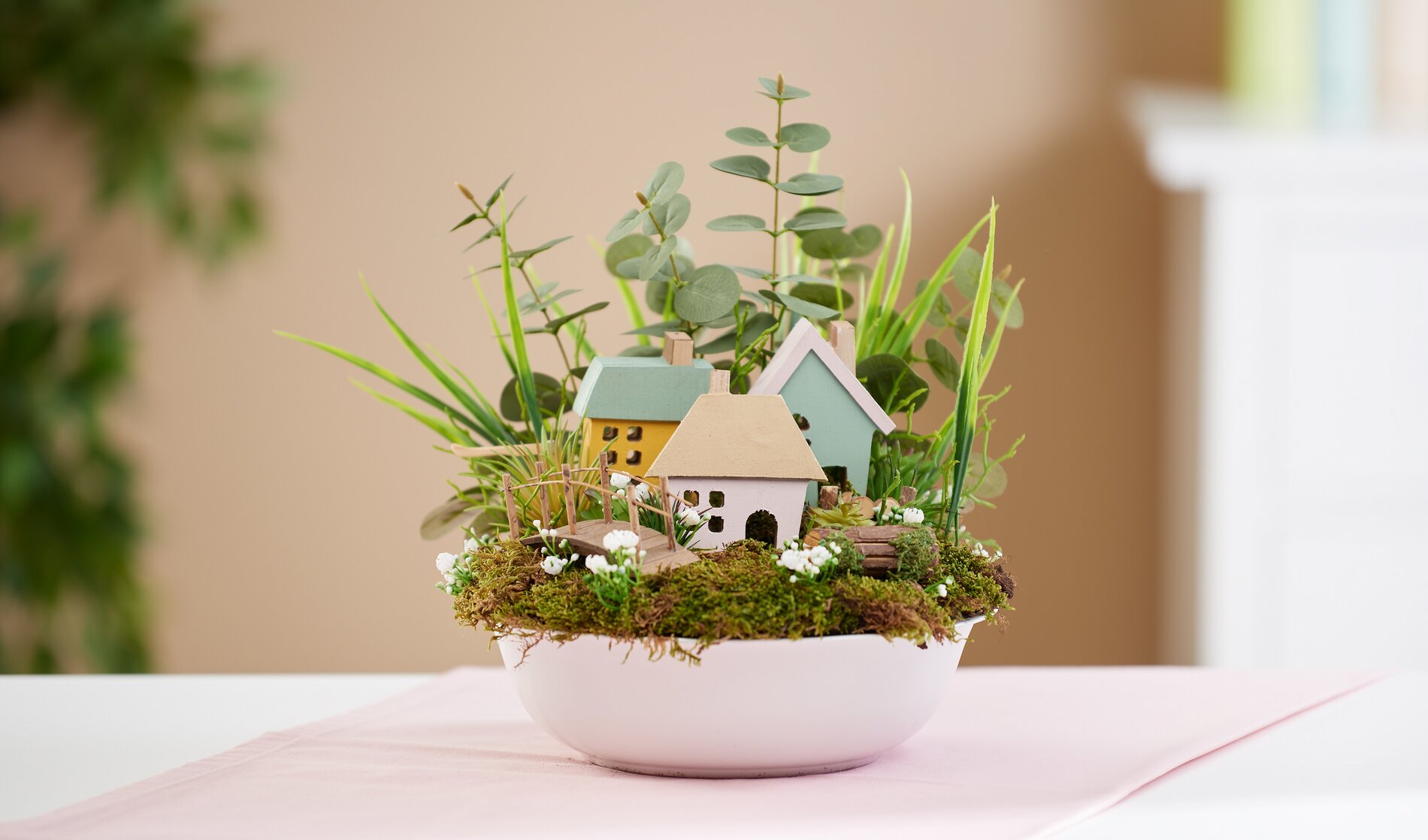 Paint the small houses with craft paints according to your personal taste. Then use some hot glue to attach the painted houses securely to the moss .