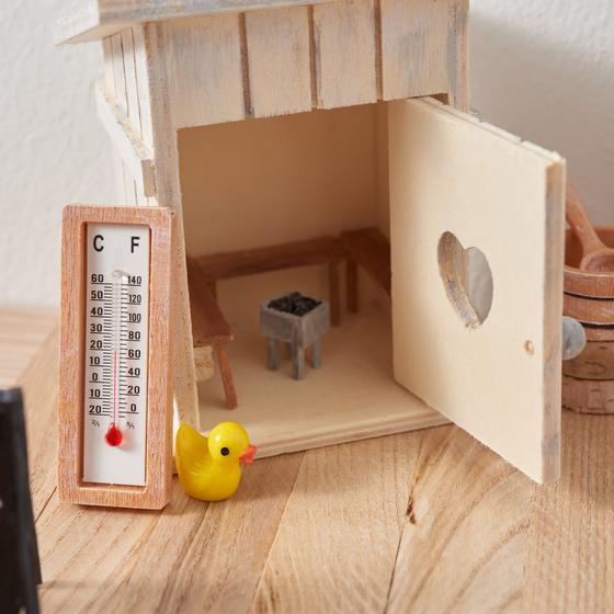 For a traditional sauna atmosphere, cut the wooden sticks into the right sizes so that they fit into your miniature toilet as a bench. Glue them in place so that they are stable. Paint the little house with the VBS Craft paints to give it character. Create a small infusion pot from the sticks and paint this too before placing it in your little house. For the sauna sign, cut a wooden spatula to size and attach a small cord loop to the back. Write "Sauna" on it to add the finishing touch.