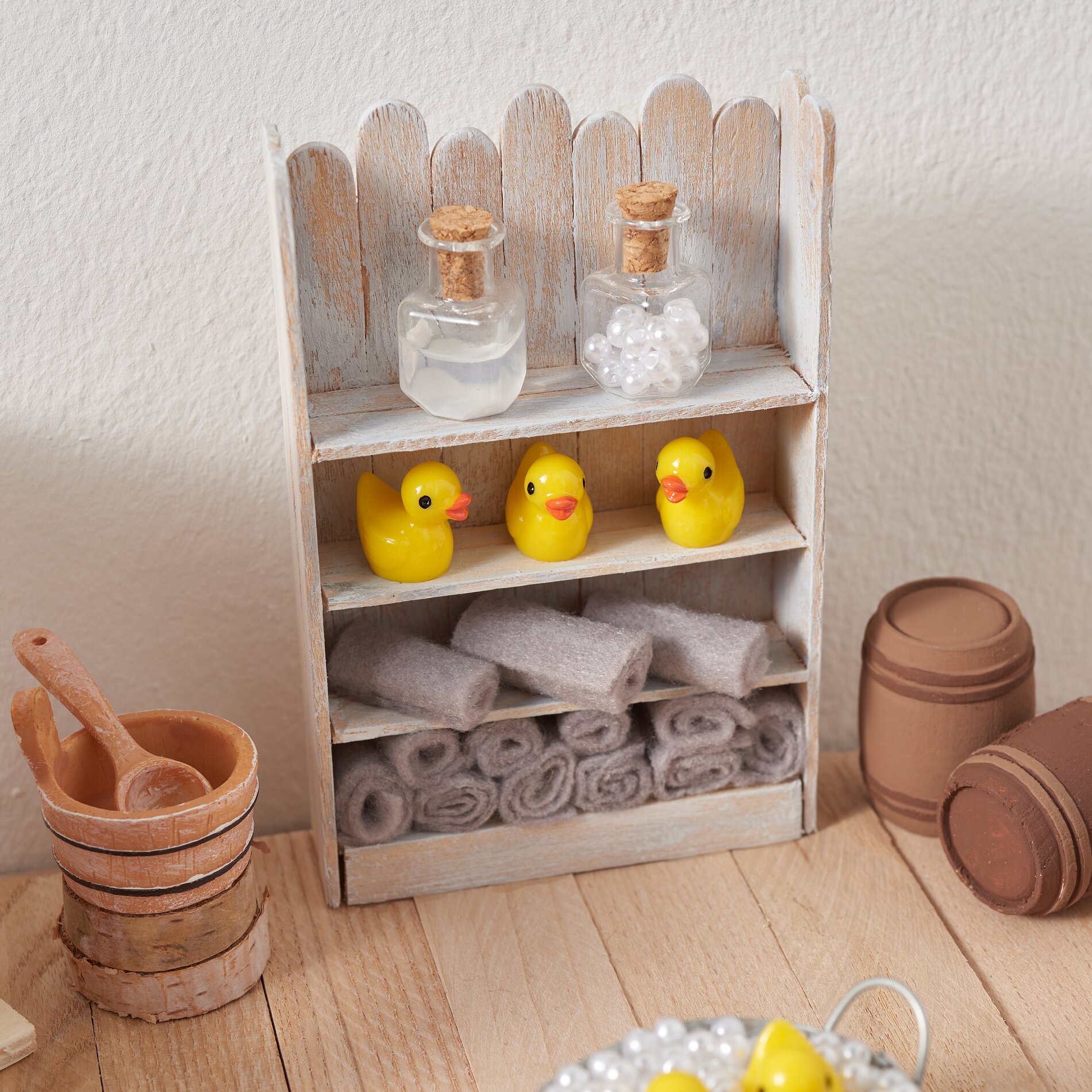 Fill a small zinc tub and a miniature bucket with wax beads VBS Wax beads. Make sure the tub is filled to the brim before placing two small ducks on top. These adorable details liven up the scene and add a playful element.