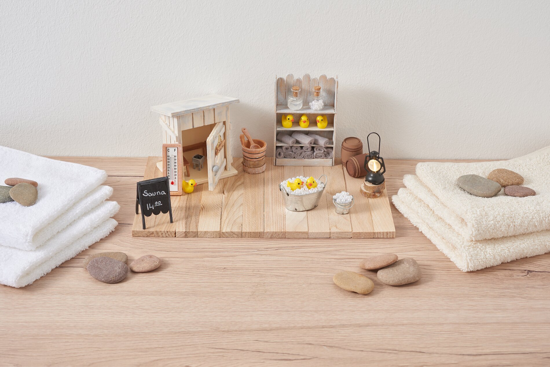 To enhance the typical sauna ambience, make small towels from craft felt. Cut strips to the desired length and thickness, roll them up and fix the end with a little glue to prevent them from unraveling.