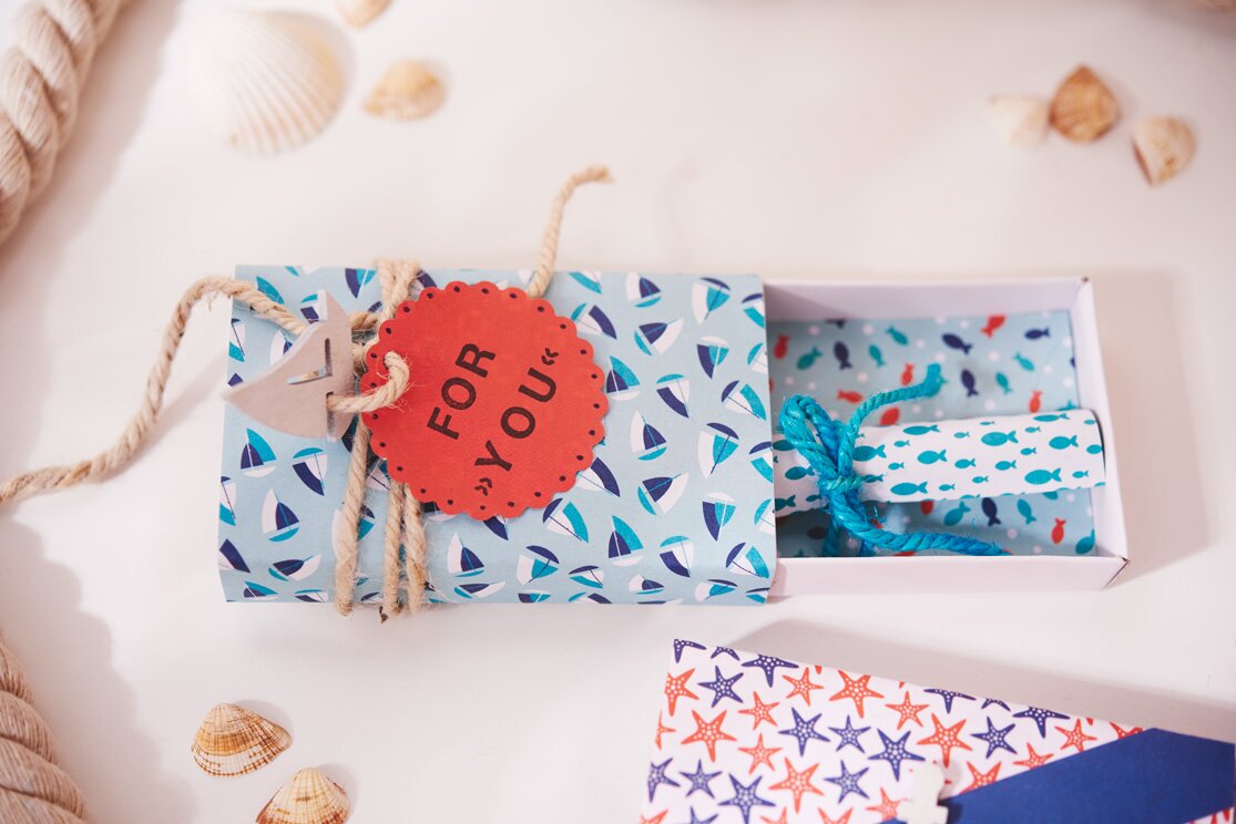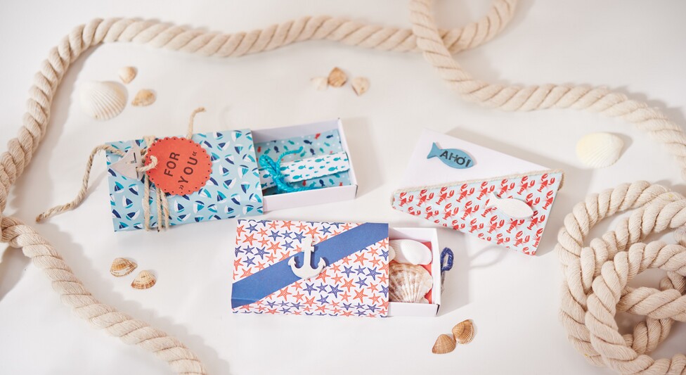 Choose different motif papers. Use the matchboxes to cut the papers so that they fit into the boxes as inserts. Cover the boxes with the pretty one and glue Paper, it in place with double-sided glue Adhesive tape