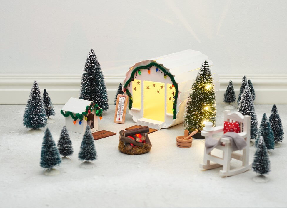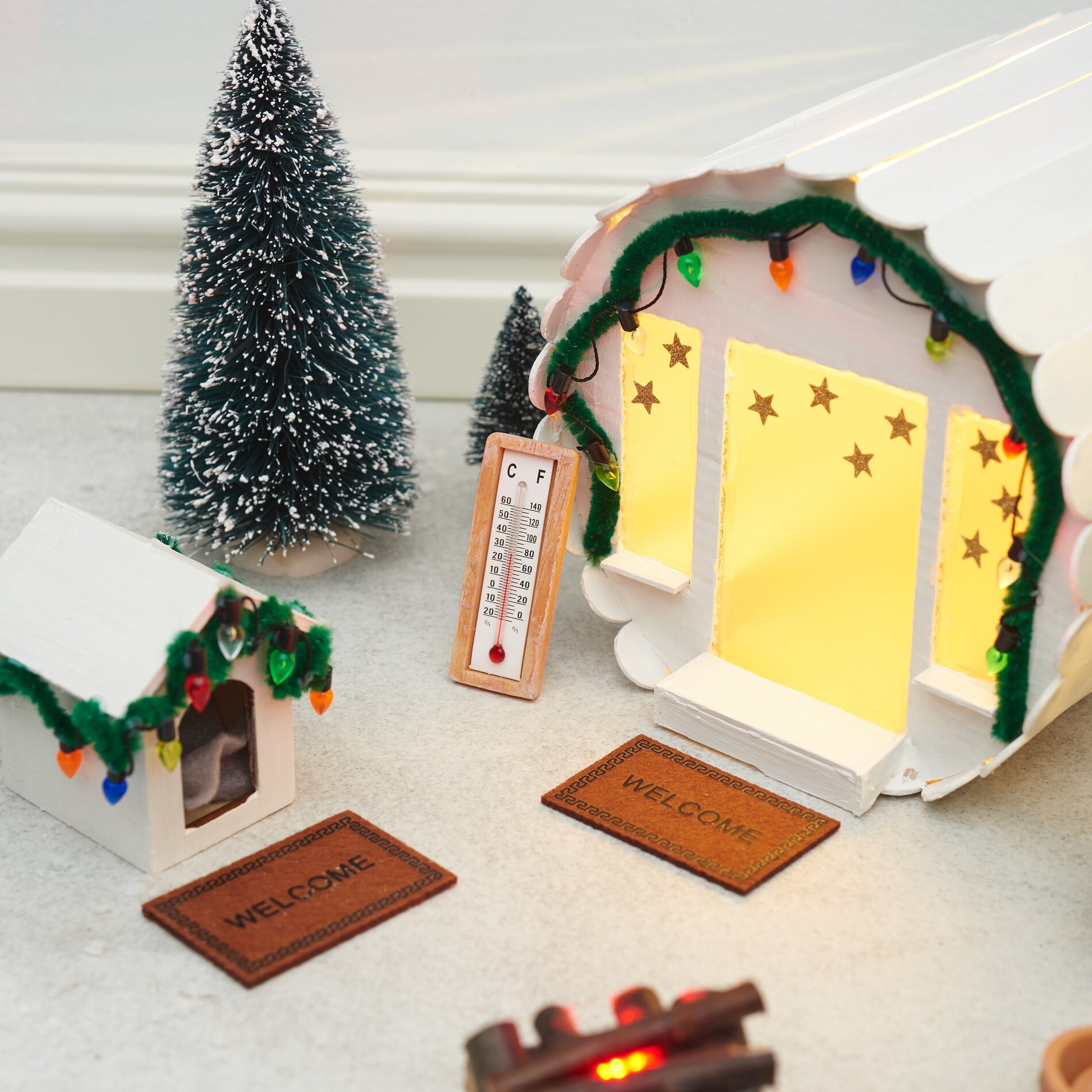 After drying, glue a green chenille wire to the sauna and the doghouse as a fir garland. Then attach the miniature fairy lights to them. For the finishing touch, stick a few gold stars on the windows and the door.