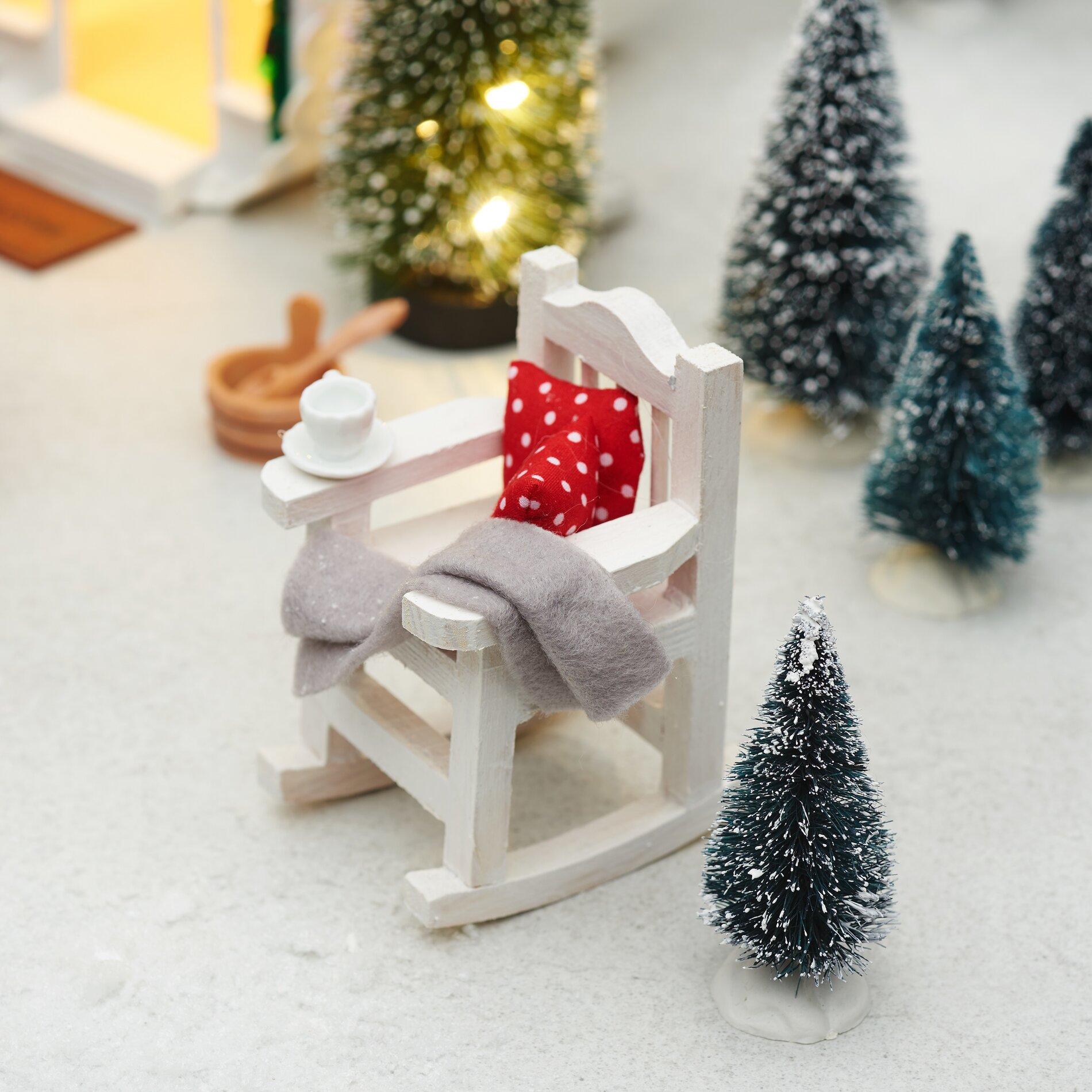 Now build a small staircase and window sills for your miniature. These can also be cut out of the spatulas, painted and glued together. These details will make your project even more realistic. When everything is dry, paint all the parts, including the rocking chair and the doghouse, with white handicraft paint.