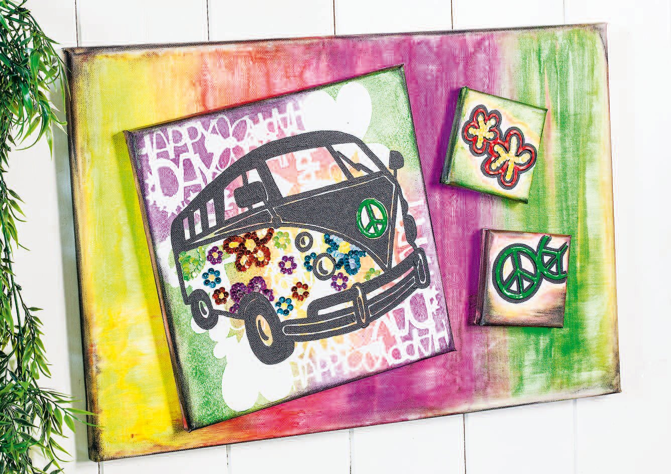 Another highlight of the bus are Sequinsthat are arranged into flowers and stuck on the bus. Finally the three small Stretched Canvas are placed on the large colour-Stretched Canvas and also fixed. For the gluing we recommend Effekt-Glue