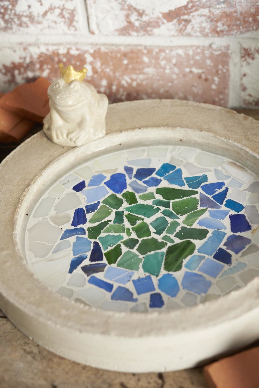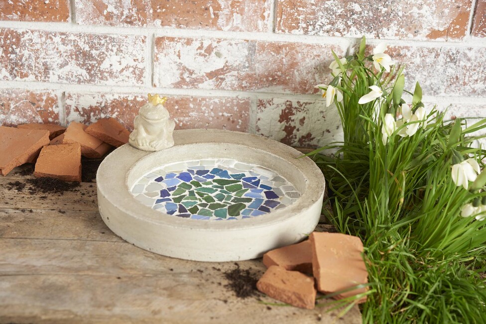covered with small mosaic tiles according to your personal taste: each tile is positioned individually and the tiles are fixed to the bottom of the bird bath with mosaic glue.