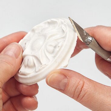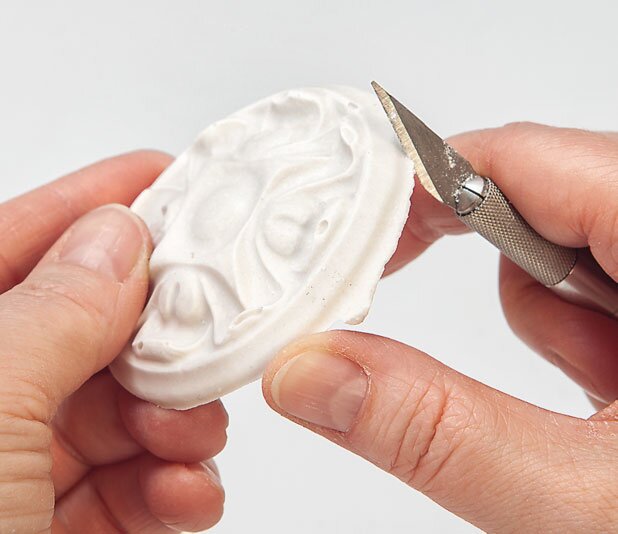 Knock the mould flat on a towel after about 30 minutes and remove the ornaments. Then immediately deburr and smooth the edges with a scalpel and Sandpaper .
