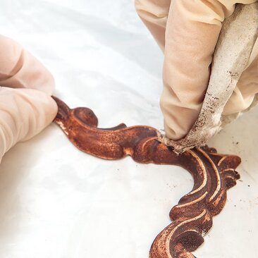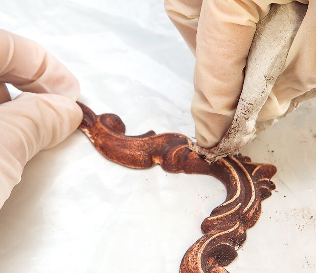 Now paint the ornaments with a dark glaze, wipe the edges of the ornaments with a dry cloth and sand lightly again.