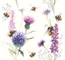 Napkin "Bumblebees and flowers" is a quarter motif and shows purple flowers and fat bumblebees on a white background. A suitable napkin for springtime decorations on a variety of surfaces.