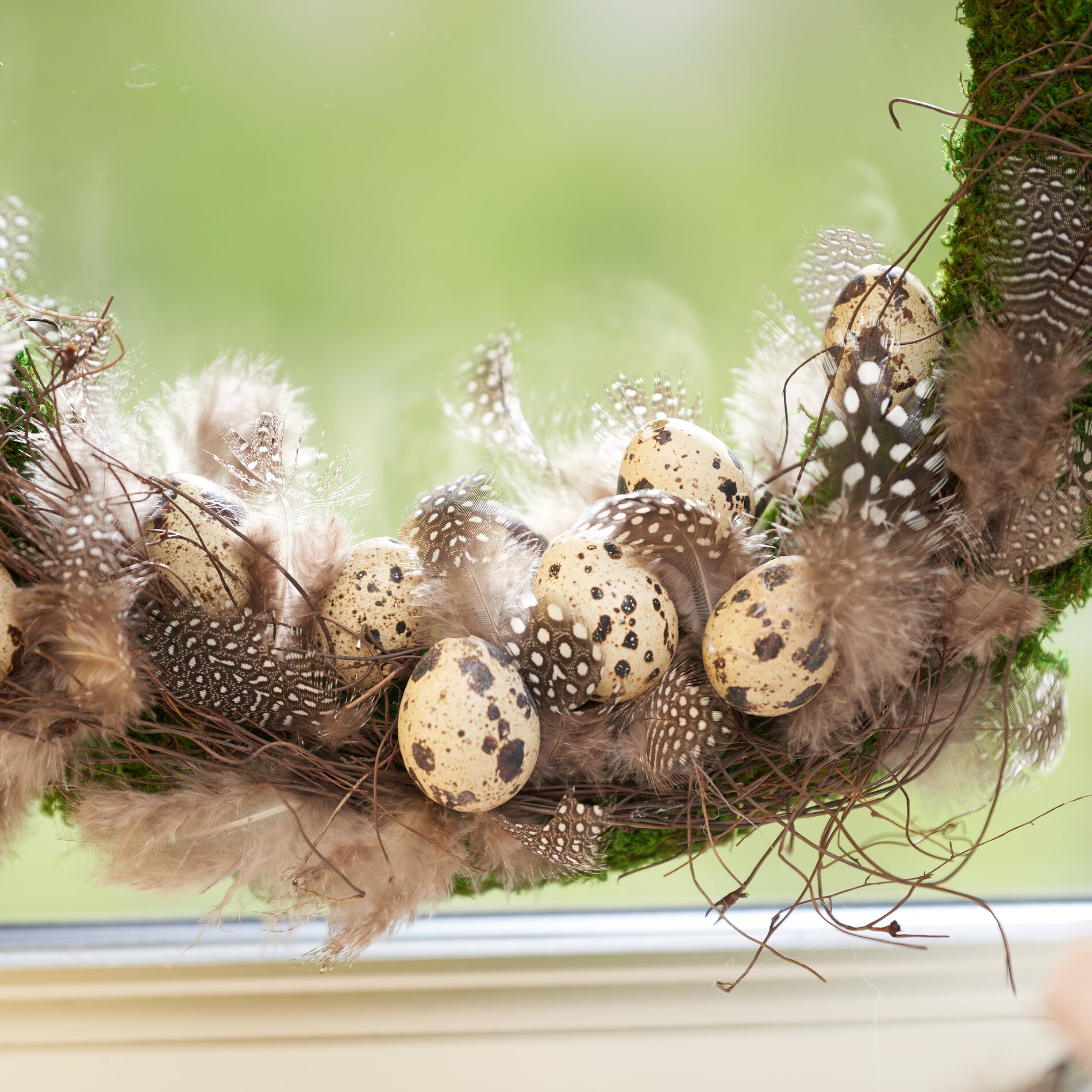Carefully place the quail eggs on the decoration-willow. Insert natural feathers into the wreath. Decorate with the wooden sprinkles or other natural materials. attach them with hot glue. Glue threads or too much hot glue can be removed as soon as the glue has cooled down.