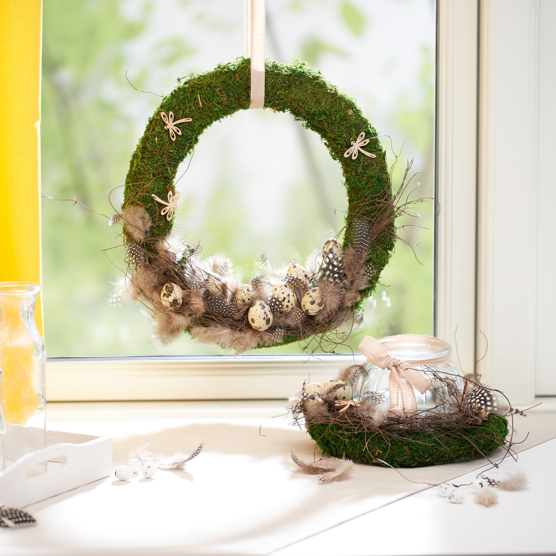 This idea is a good example of decorative handicrafts with natural materials for the Easter season. Moss wreaths, decorations-willow and more bring the magic of nature directly into your home. Get inspired and create your own natural Easter decorations with our materials!