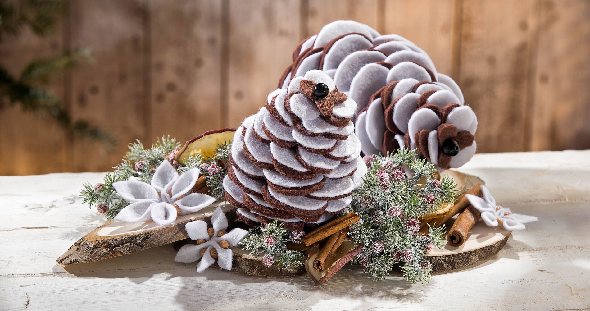 Almost like real cones these large specimens look like they Felt. are made up of different sized blanks and thus get a lifelike form. The finished cones look especially pretty when they are Natural materials decorated with Wooden discs different ones.