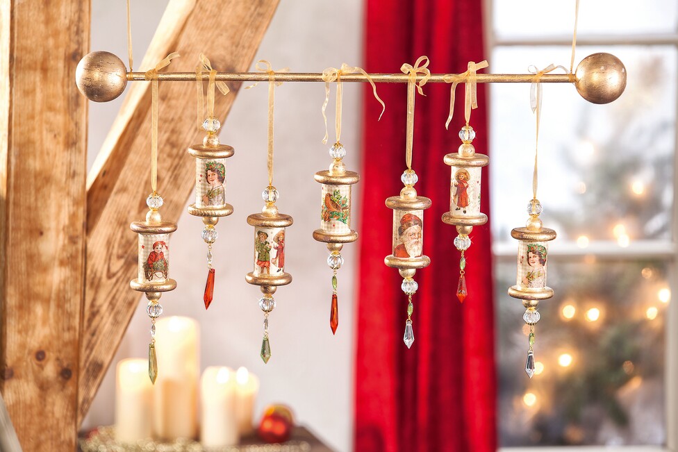 For this beautiful, extraordinary Christmas decoration, wooden spools with nostalgic napkin motifs and noble are transformed. Leaf metal set Acrylic beads additional light reflections.