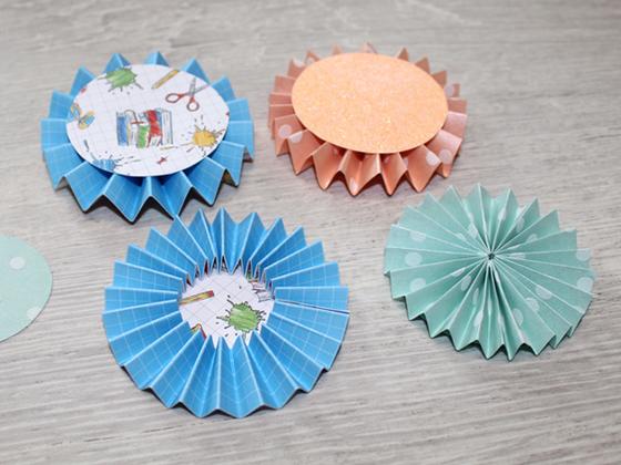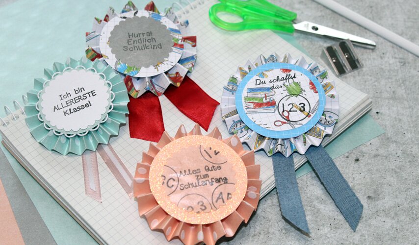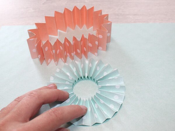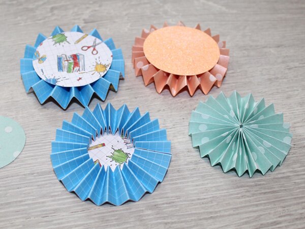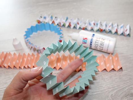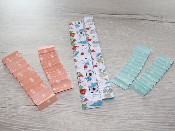 If you are using large sheets, one long strip is enough, for example. For A4-sized material, you will need 2 strips. If you have even shorter strips, you will need to work with 3 or more. The width of your strips determines the later diameter of the rosette. If you have strips that are 4 cm wide, your rosette will have a diameter of at least 8 cm.