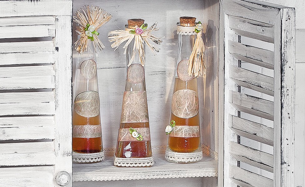 Cut out the motifs and stick them Napkin varnish onto the glass bottles.