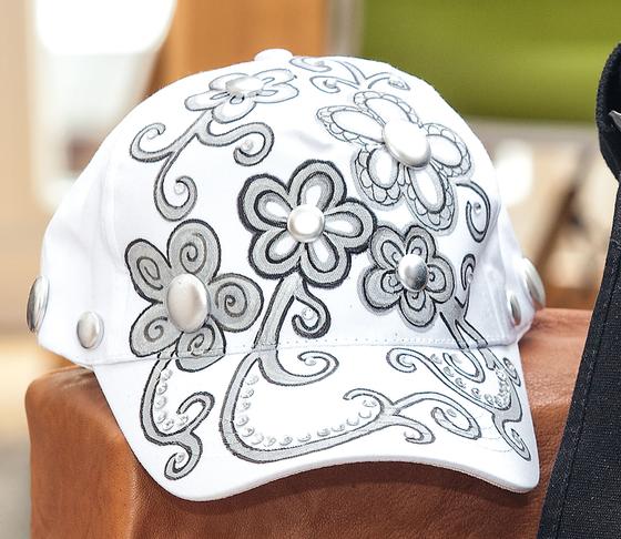On fabric rivets and rhinestones are very popular. The white cap is painted with Posca pens and then decorated with rhinestones and big rivets. You can design the pattern according to your own taste.