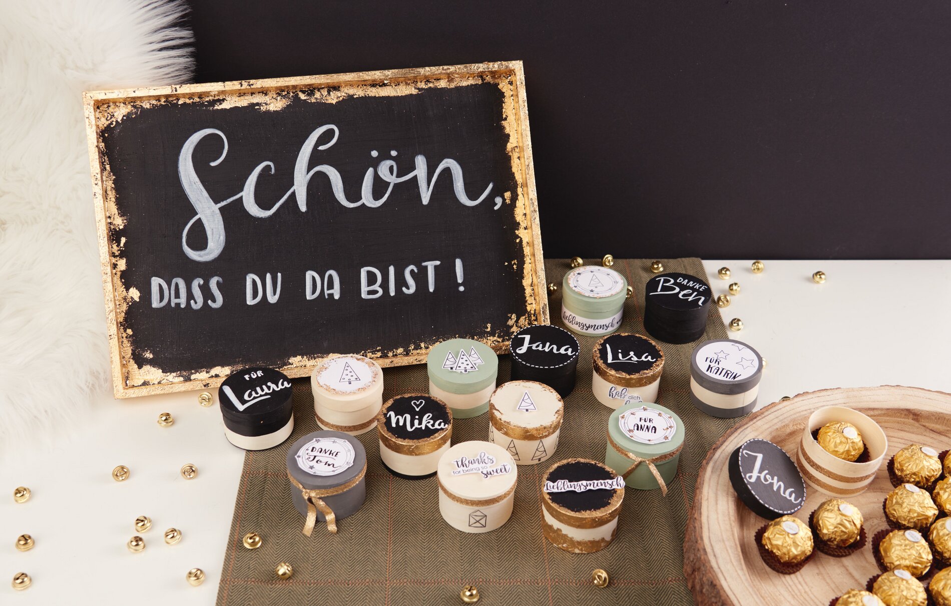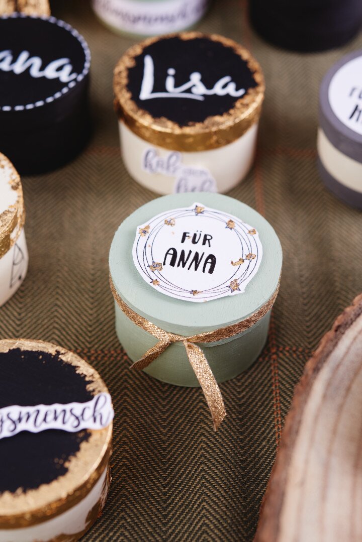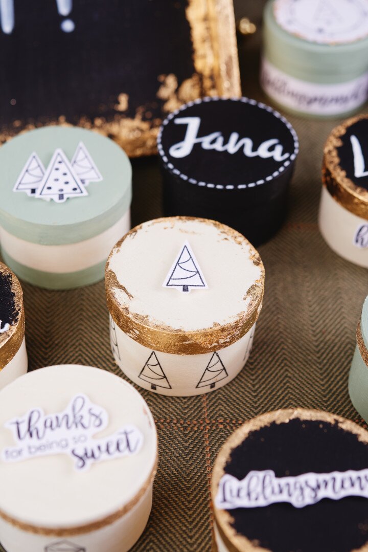 Stamp pretty designs and messages on white cardstock. Then cut or punch them out, then glue the paper onto or even onto the chip boxes using craft glue or 3D glue pads. You can now