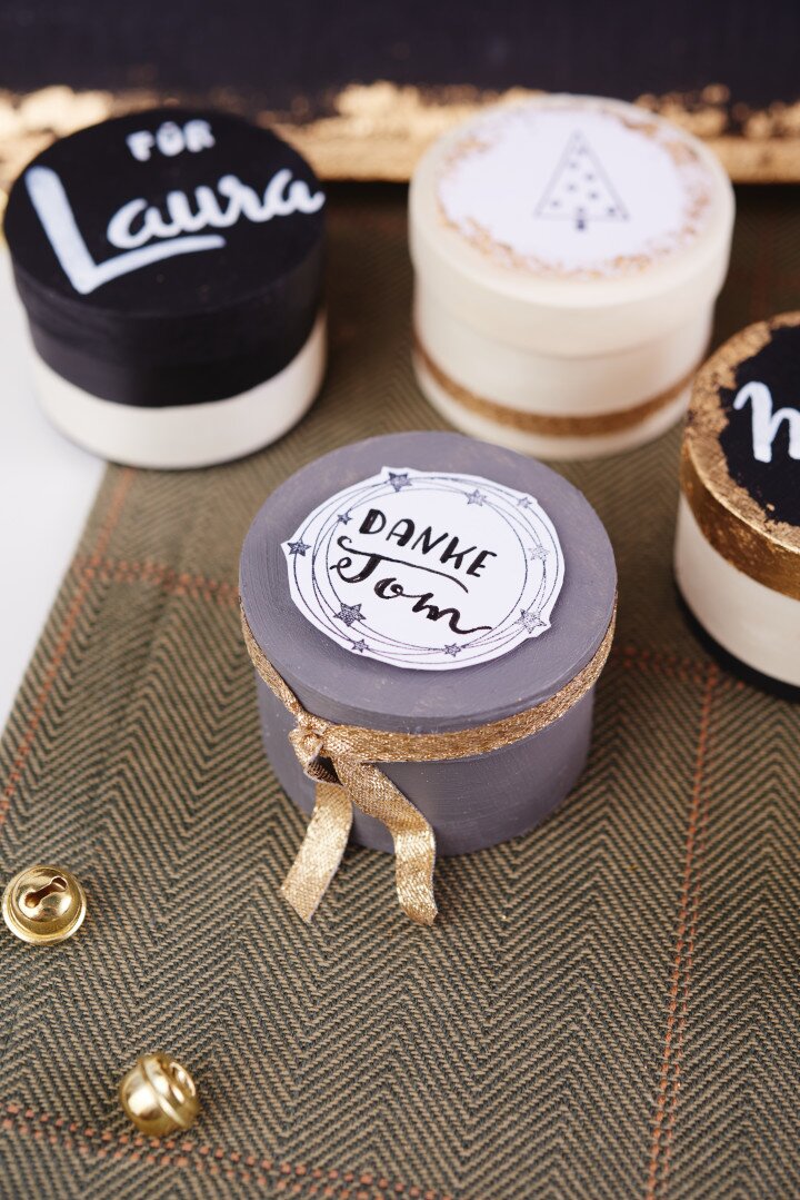 Use a chalk marker for writing on chalkboard paint on the tray and on the spandex lids coated with the black chalkboard paint. And finally, decorate some of the spandex tins with gold decorative ribbon.