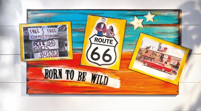 Here, photo elements have been spotted onto painting board , perfect for capturing vacation memories. Also try using old newspaper articles or clippings from fashion or home magazines instead of photos. Travel magazines or vacation catalogs also offer interesting possibilities.