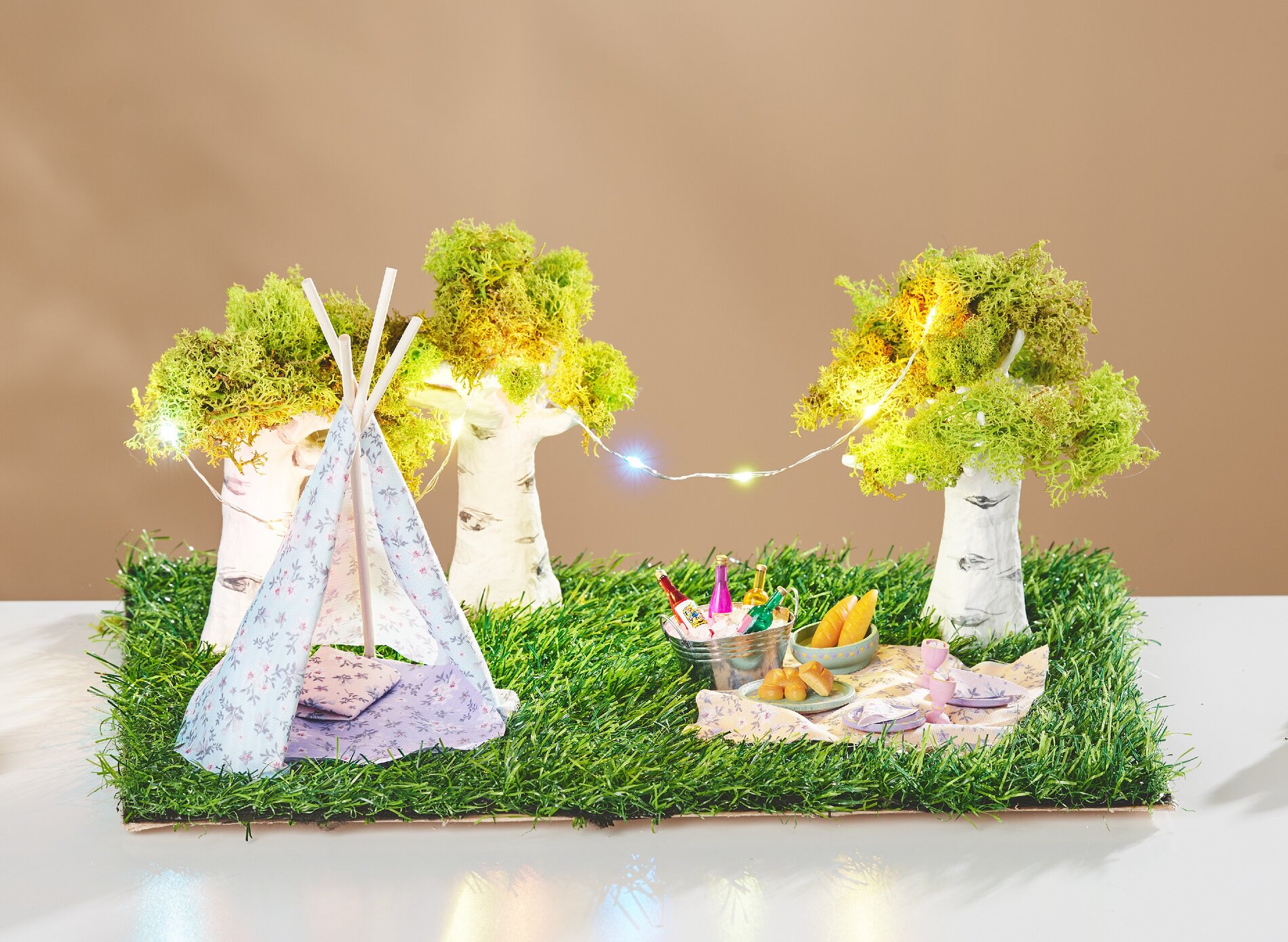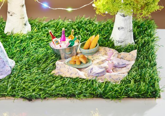 To add the finishing touches, you can decorate the whole scene with more fabrics as well as miniatures. How about small additional picnic blankets or a bicycle? This will make the whole thing even more realistic.