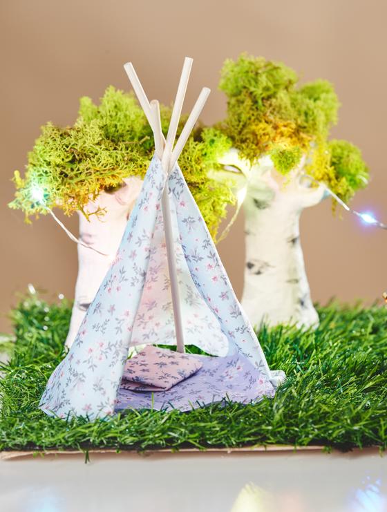 Once the tepee is in place, stretch the piece of fabric over it and fix it with a little glue.