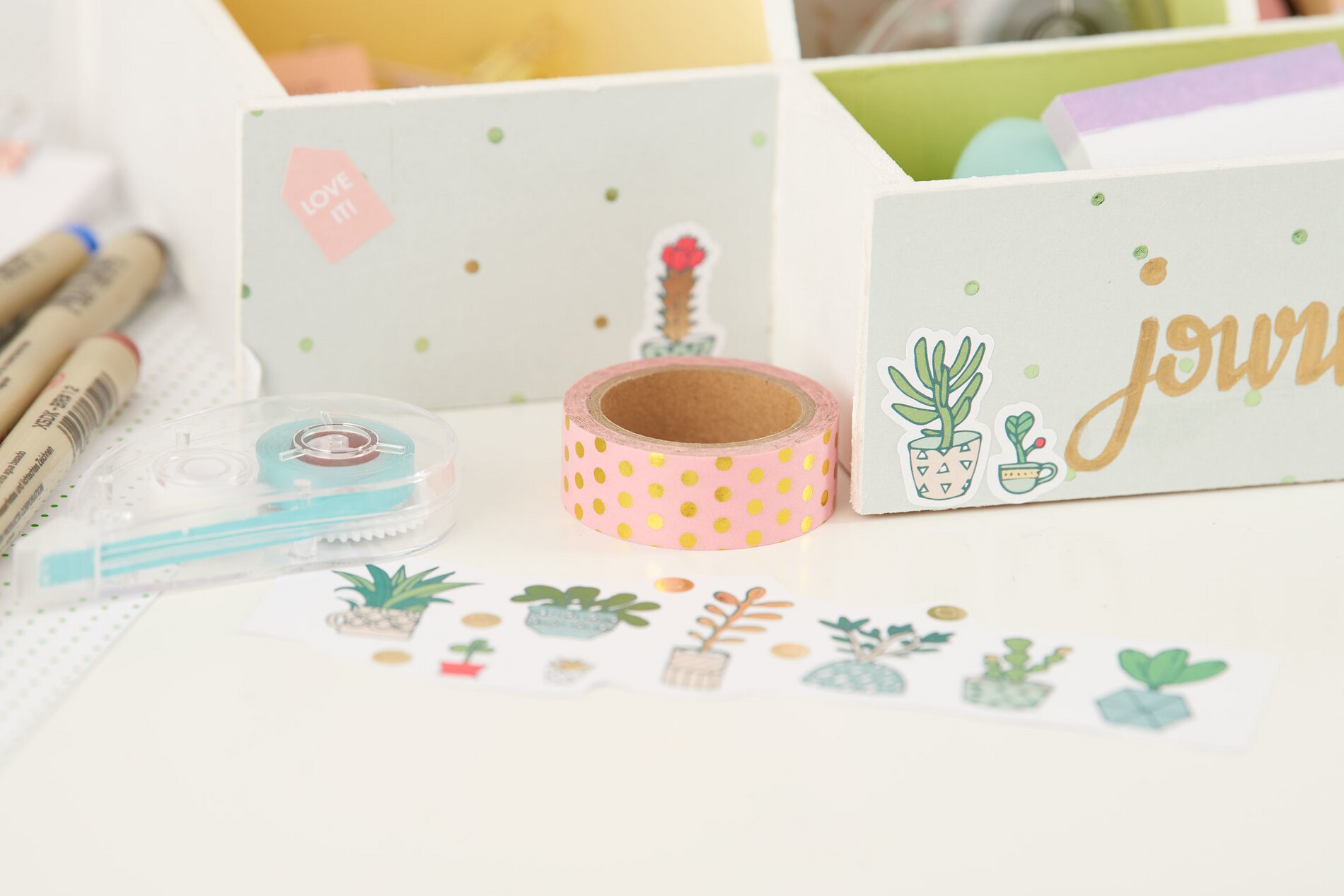 Stick the Toolbox to your personal taste with various craft papers, self-adhesive tapes and stickers. Label the Journal Box with a golden pen.