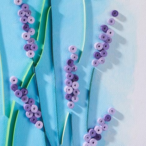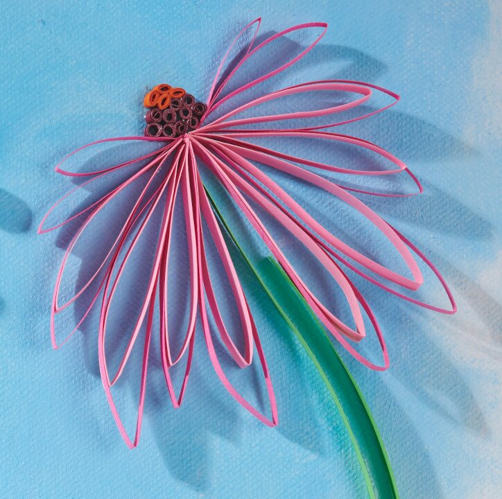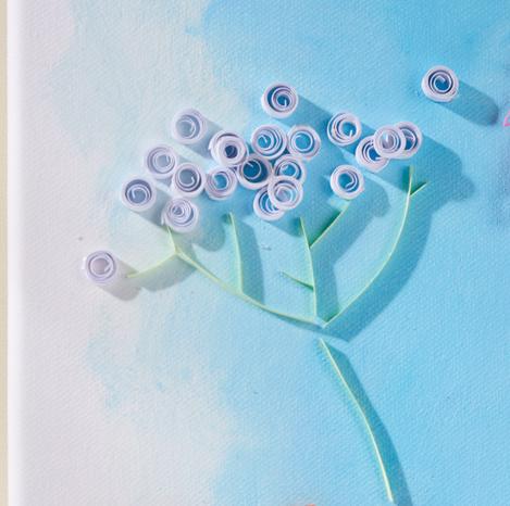 Make squiggles and loops from the various quilling strips. With the VBS Quilling stencil, a Quilling pen you will certainly succeed these shapes well. Fix each part with craft glue. Sobad you have a sufficient number of individual quilling shapes arrange them on the stretcher to different flowers and glue them on.