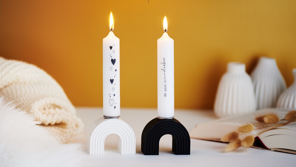 Aren't the candlesticks in rainbow-form pretty? With the matching candles with beautiful motifs and sayings, they are a decorative highlight in your four walls and also ideal as gift idea . The candle holders are made using the trendy casting technique. And the highlight: the casting compound is now also available in black! The black candle holder complements the white stand perfectly.
