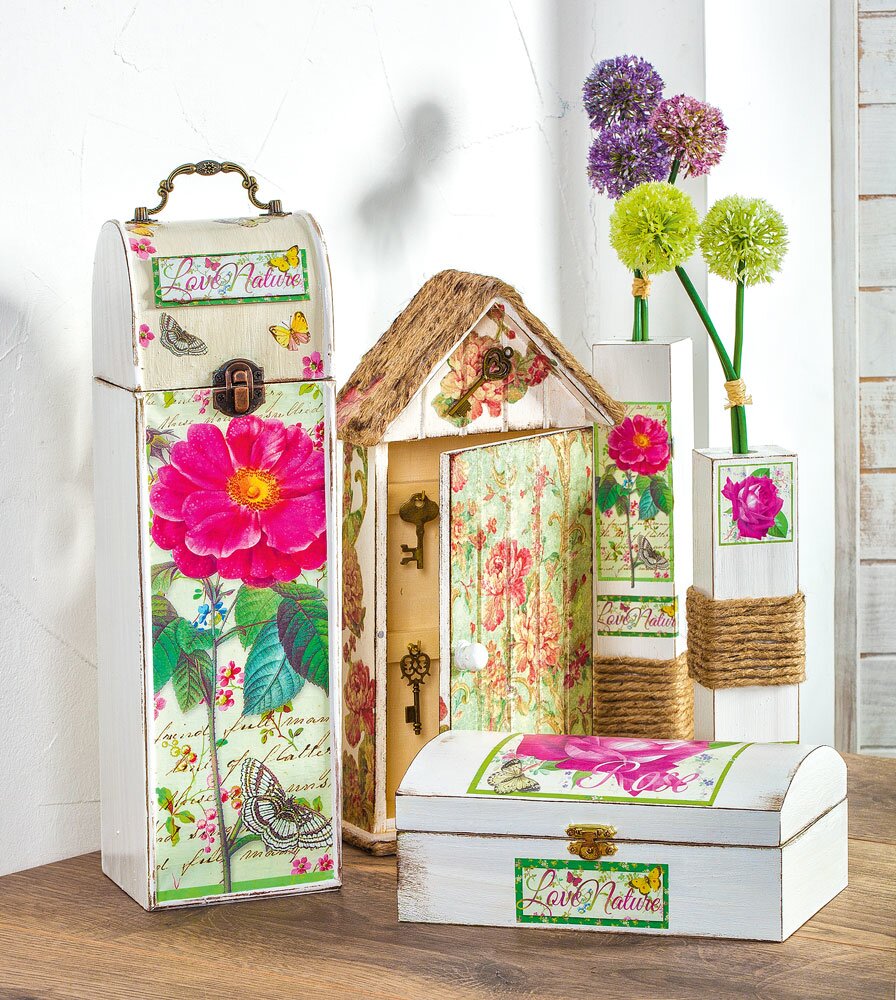 This romantic country house decoration with the playful roses reminds of a small still life. With an eye for detail, you can create such beautiful Gift wrappings as this wine box, which in itself is an exceptional gift.