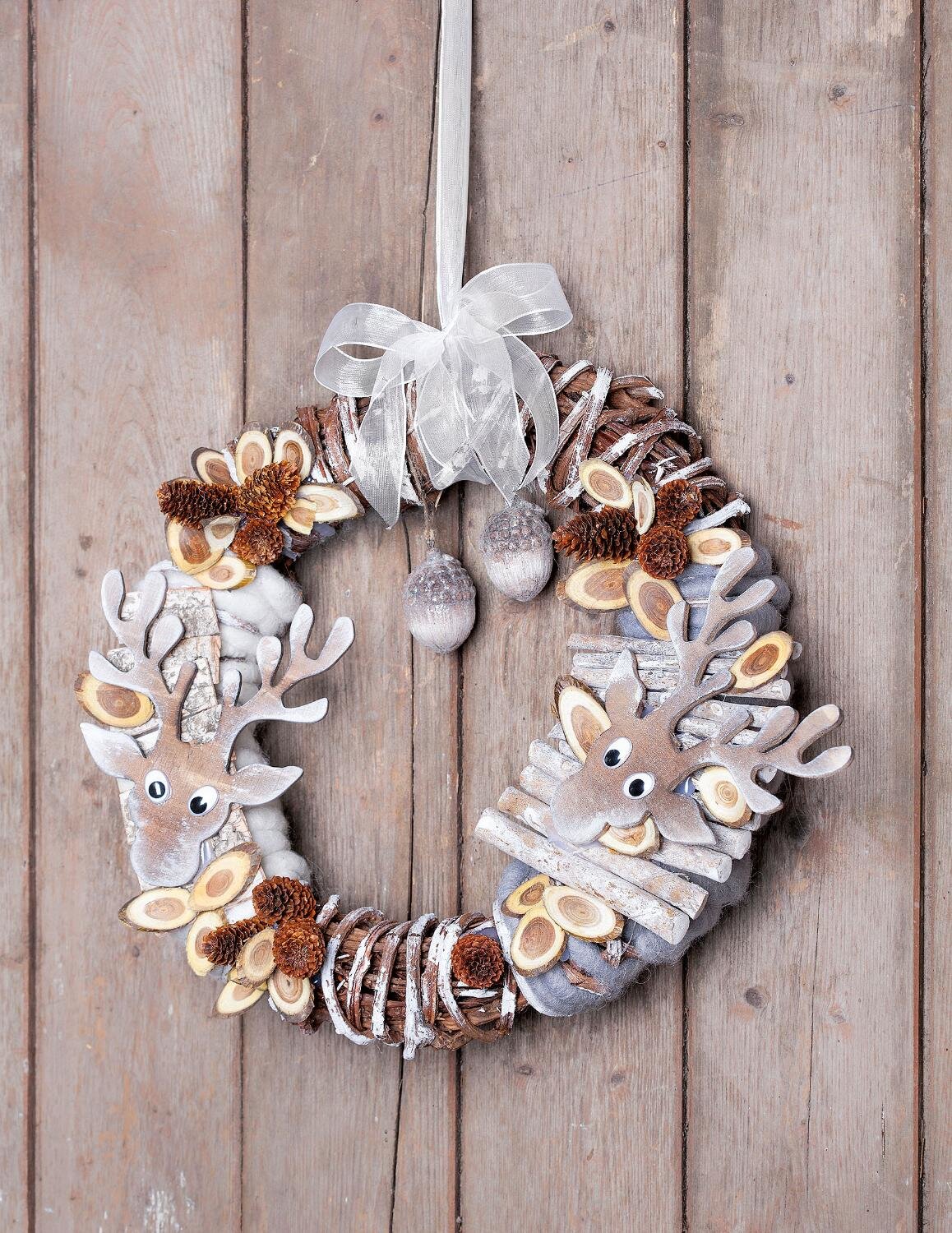 Wipe over one side of the wreath and the edges of the deer head with the white paint. When dry, wrap the felt cord around the wreath. Divide the cinnamon sticks in the middle with a saw and wipe up some white paint here too. Glue on the sticks, cones, bark discs and the bark of the tree. Position the Wobbly eyes and arrange the deer heads decoratively before fixing them with hot glue as well. Now attach the Organza ribbon as a suspension and hang the acorns in the wreath.