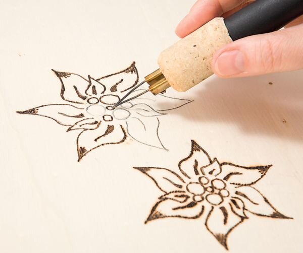 First smooth the Wind light with Sandpaper and round off the corners. Fix the template with graphite paper and crepe-Adhesive tape and trace the contours with a ballpoint pen. Trace the transferred motifs with the fine tip of the firing station, then place small dots around the hearts.