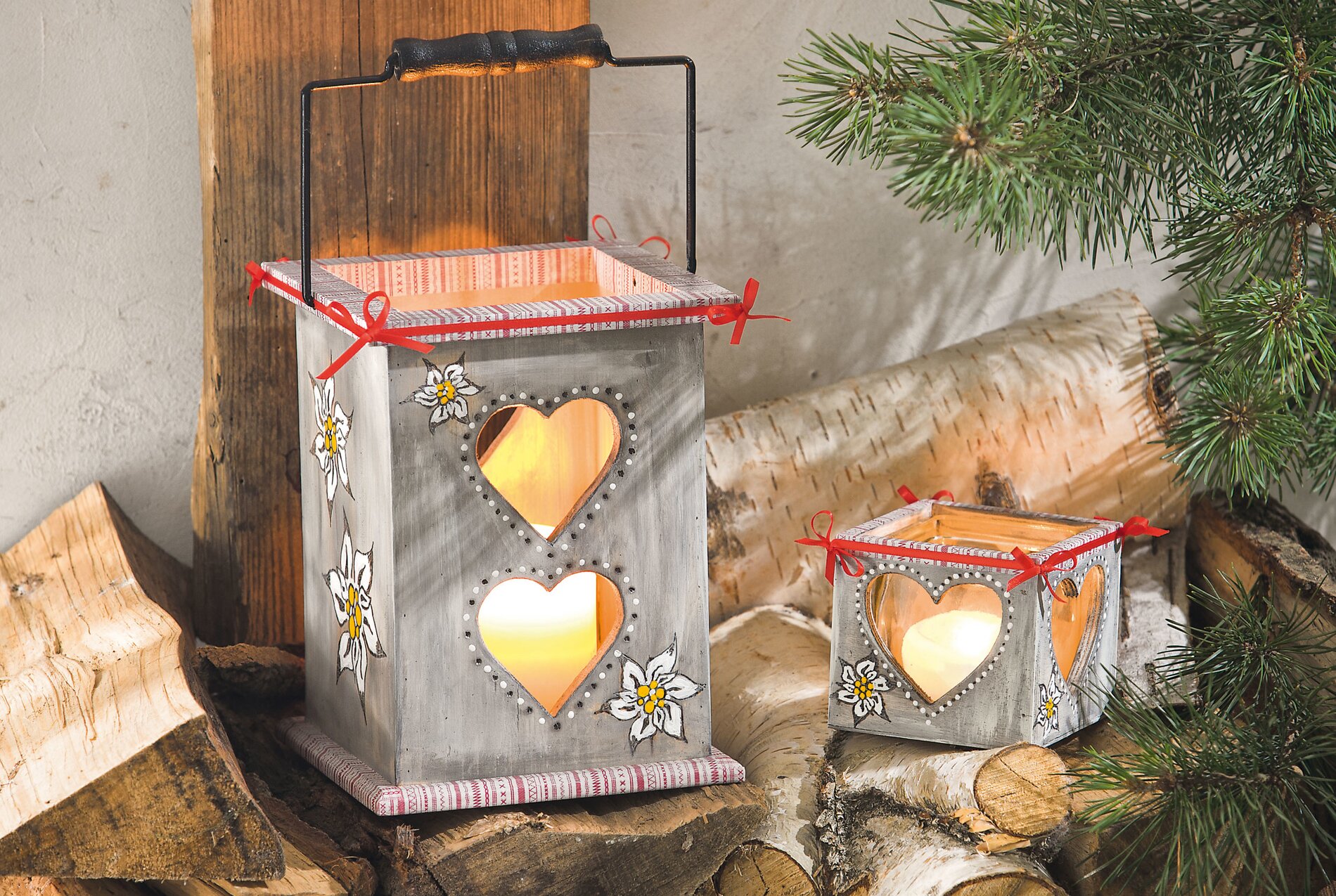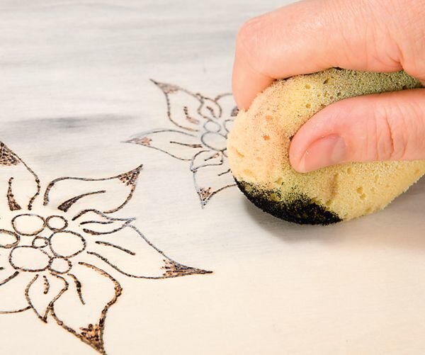 Wipe diluted antique white and black Handicraft paint one after the other with a damp sponge over the surfaces and remove again and again with a dry cloth until the desired effect is achieved. After drying, design the flowers with white and yellow Handicraft paint . Finally, apply self-adhesive Masking Tape, over it add Ribbon to Satin ribbon and dab white dots between the burnt dots around the hearts.