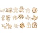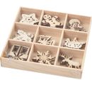 The natural colored Scatter decoration "Christmas motifs" in the 9 designs star, gingerbread man, snowman, holly, bells, sleigh, gift, snowflake and moose are approx. 2.8 cm tall and made of laser cut wood. A total of 45 pieces are included.