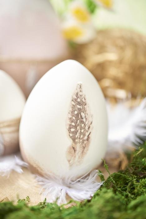 Carefully cut or tear out the feather motifs and fonts from the Napkin . Spread the cast eggs with Napkin varnish and stick the Feathers on the white surfaces with a brush. If the motifs are torn, the areas that are not glued are then coloured, so that the Napkins-edges are unobtrusive.