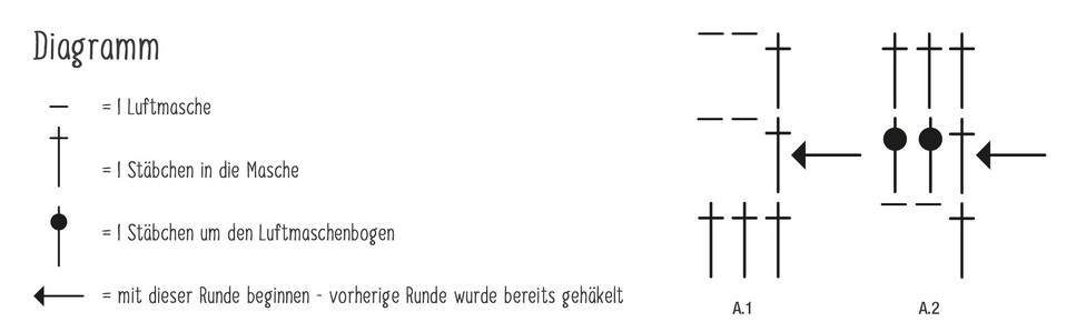 1. ROUND: 1 air mesh (= 1 fixed mesh) 1 fixed mesh into the next air mesh, * skip the next air mesh, 1 fixed mesh into each of the next 4 air meshes *, from *-* work 28 times in total = 114 fixed meshes. Apply 1 marker thread at the beginning of the round and apply 1 marker thread after 57 firm stitches (= 57 firm stitches left until end of round)