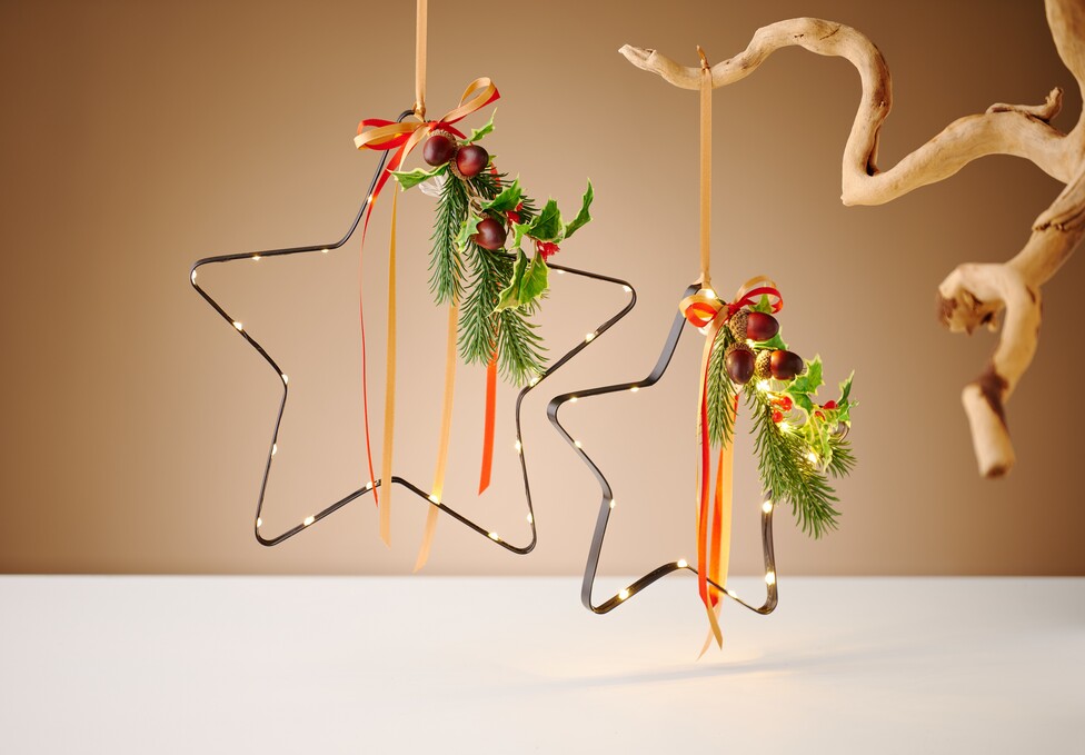 Next, carefully tie the artificial plants together with a ribbon or wire and attach them to the star using the same ribbon or wire. For extra stability, you can use some hot glue here too. Make sure that the plants are securely fastened and do not slip.