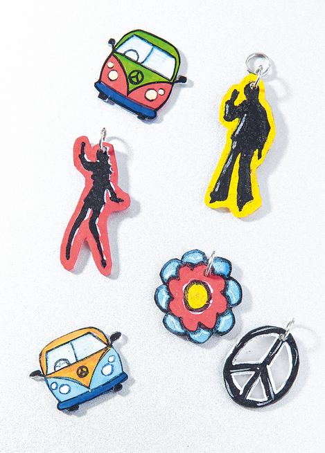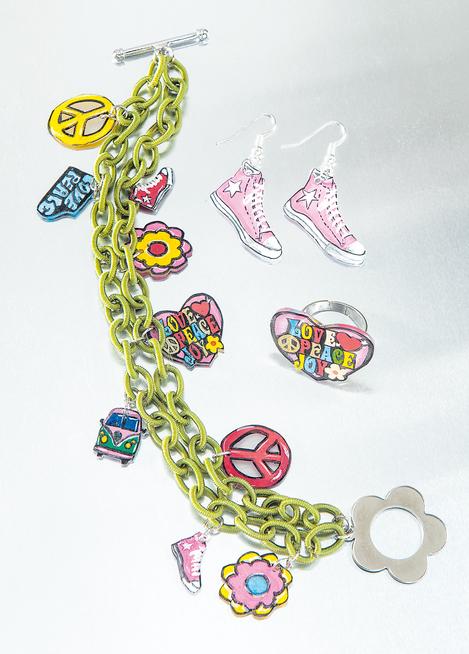 Colourful and cheerful are the jewellery elements in retro design, which here are attached to the charm bracelet, earrings and finger ring. They are painted in a convenient size on shrink foil and then brought to their final size in the oven.