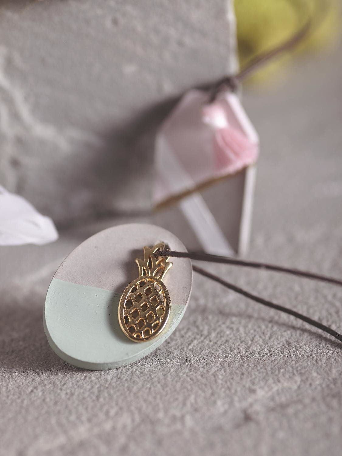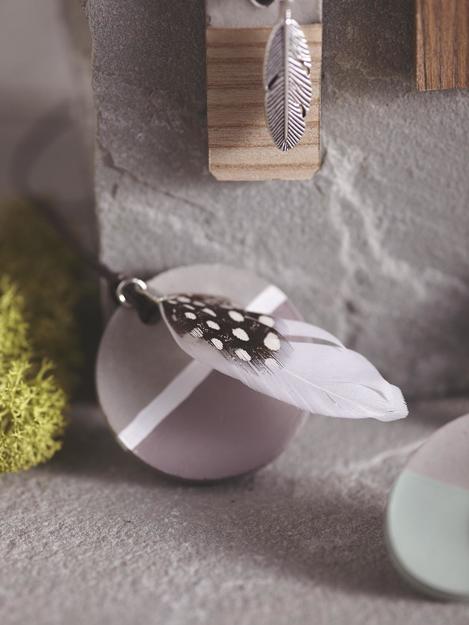 The hole for the pendant, which is cast at the same time, can be easily fitted with a leather strap or a metal chain and a small metal accssoire can be tied in front of the concrete pendant according to your personal taste.