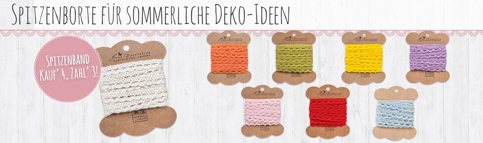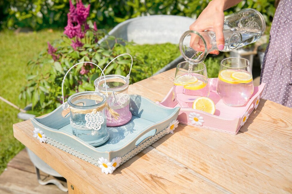 Trays and glass lanterns are decorated with lace trimmings, small daisy blossoms, scattered pieces, natural bast or your own decoration ideas to suit your own taste.