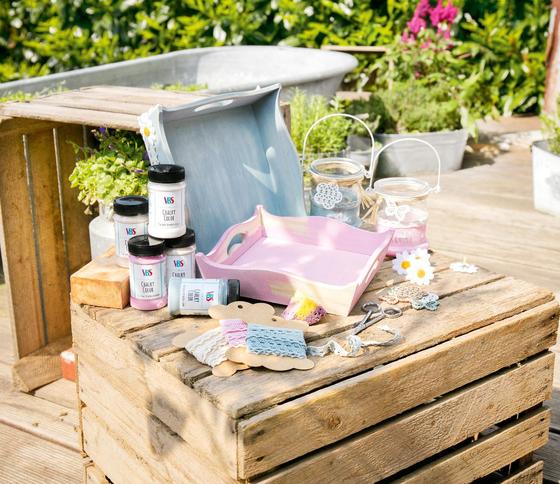 The tray trays are primed with Chalky color antique white and a Paint sponge . Once the paint has dried, everything is covered with a layer of Chalky Wax. Once again dried, a third layer of chalky paint follows, for example in pastel pink or Petrol Blue. Once this third layer of paint has also dried, the top layer of paint is sanded down again slightly: carefully on the surfaces, a little more on the edges. The previously applied wax serves as a protection for the lower paint layer against too much abrasion.
