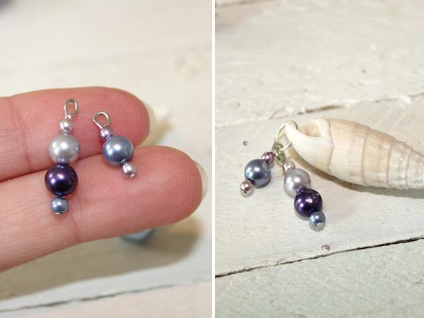Take three large, flat shells and drill a hole in the top center of each. Thread the desired beads onto a prism pin and push it through the hole of the sea shell. Shape the protruding end of the pin into an eyelet using pliers. If it is too long, shorten it with side cutters. Before closing the eyelet, attach a chain pin onto which beads are also threaded. Attach the ear hole hooks to the end eyelet.