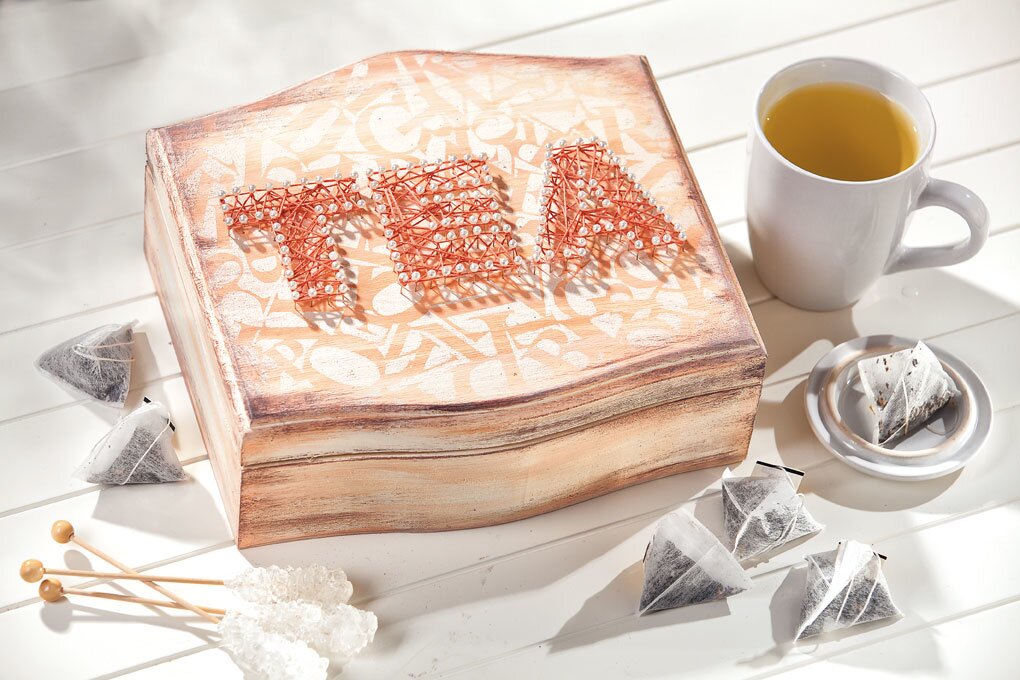 Cut out the letters from the pattern and transfer them onto the lid of the tea box with the line-ex pen with a 5 mm gap.