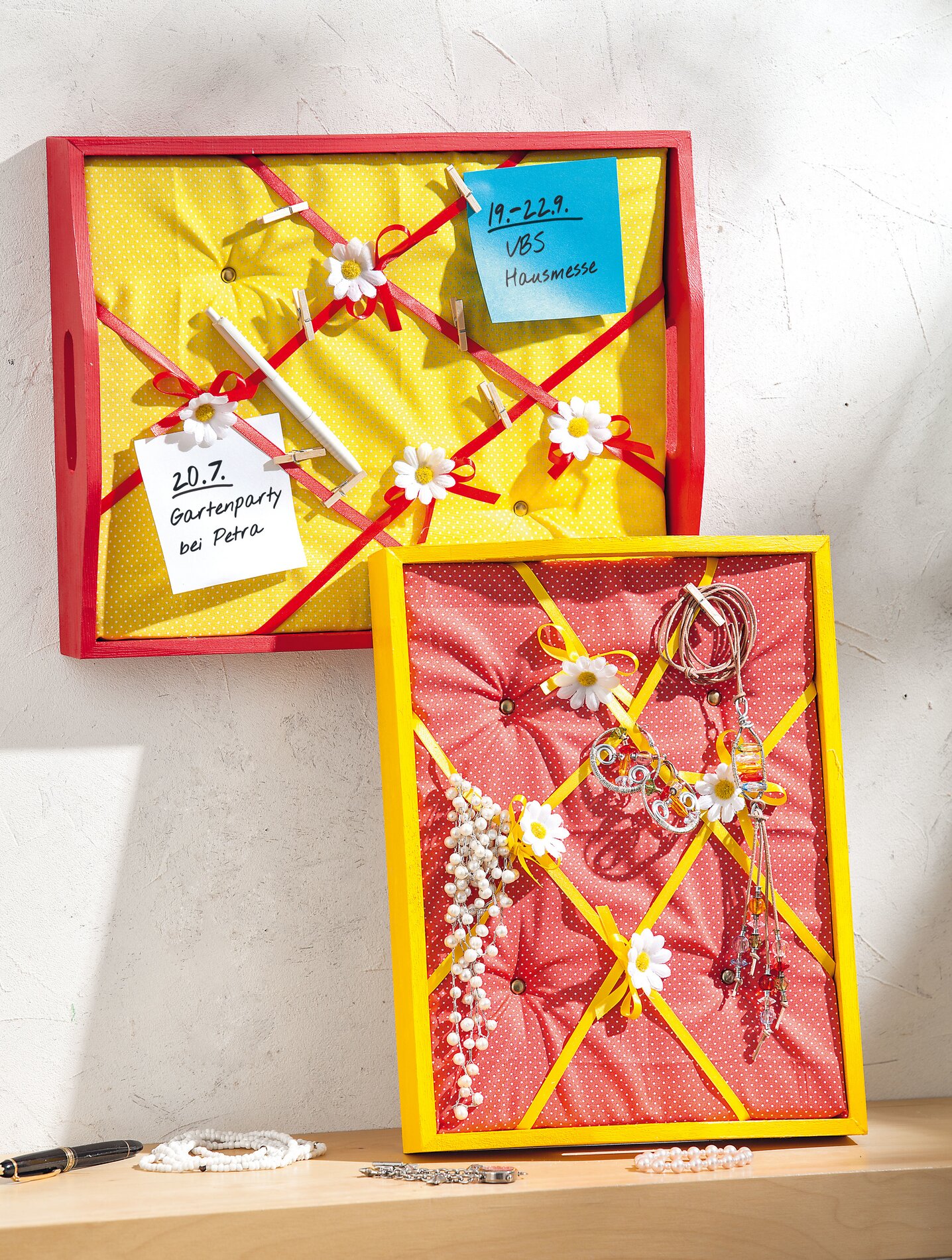 Finally connect the pulled through ribbons diagonally with bows, glue single daisies on the fabric and bows with a hot glue dot.